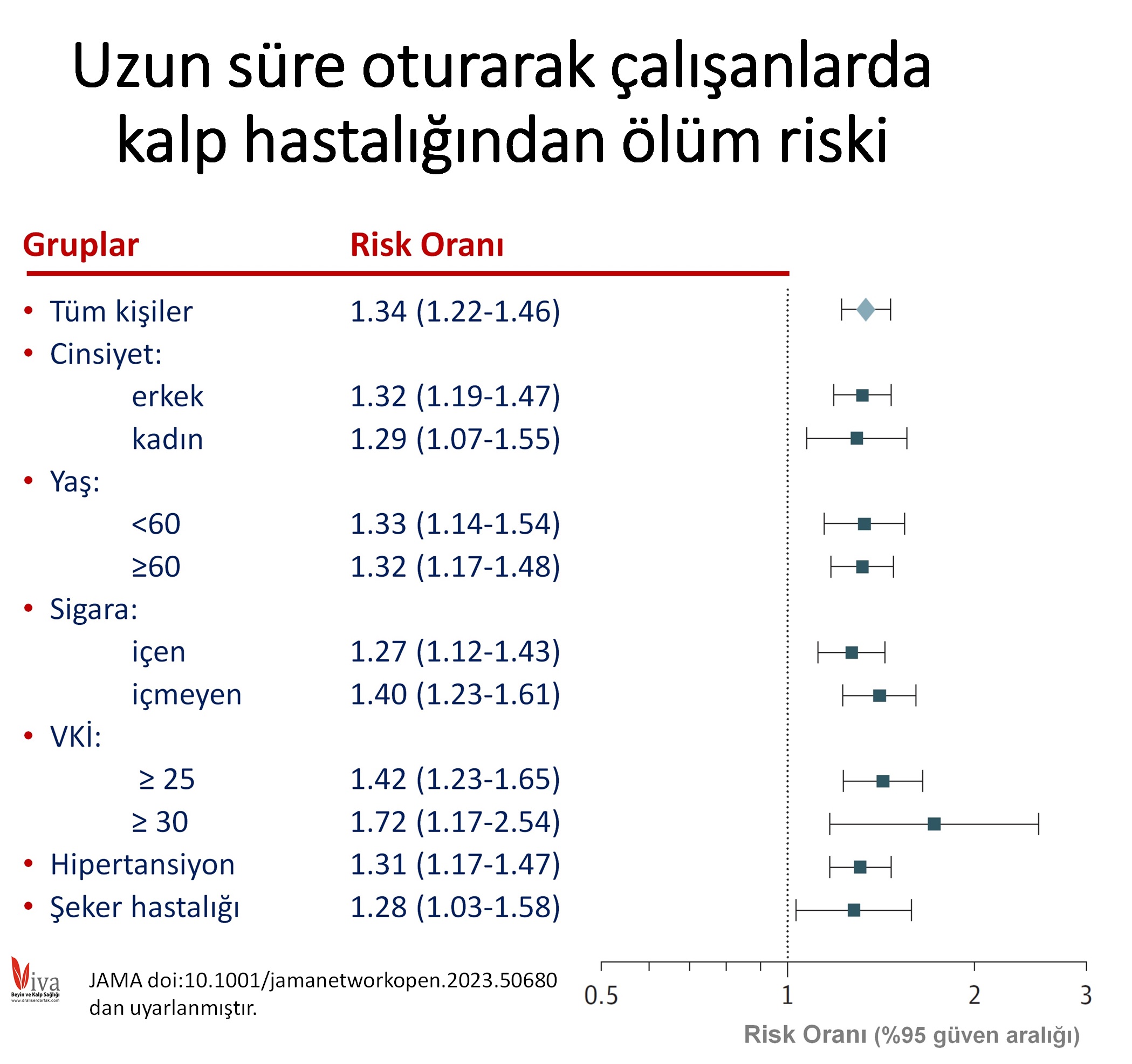 Şekil 1’deki grafikte, kesintili dikey çizginin sağ tarafı ölüm riskinde artışı gösteriyor. Görüldüğü gibi tüm kişilerde, her iki cinsiyette, 60 yaş altında ve üzerinde, sigara içen ve içmeyenlerde, kilosu daha fazla veya daha az olanlarda, hipertansiyonu olanlarda, şeker hastalığı olanlarda ayrı ayrı risk mevcut. Yani ağırlıklı olarak oturarak iş yapan herkesin kalp hastalığından ölüm riski daha fazla.