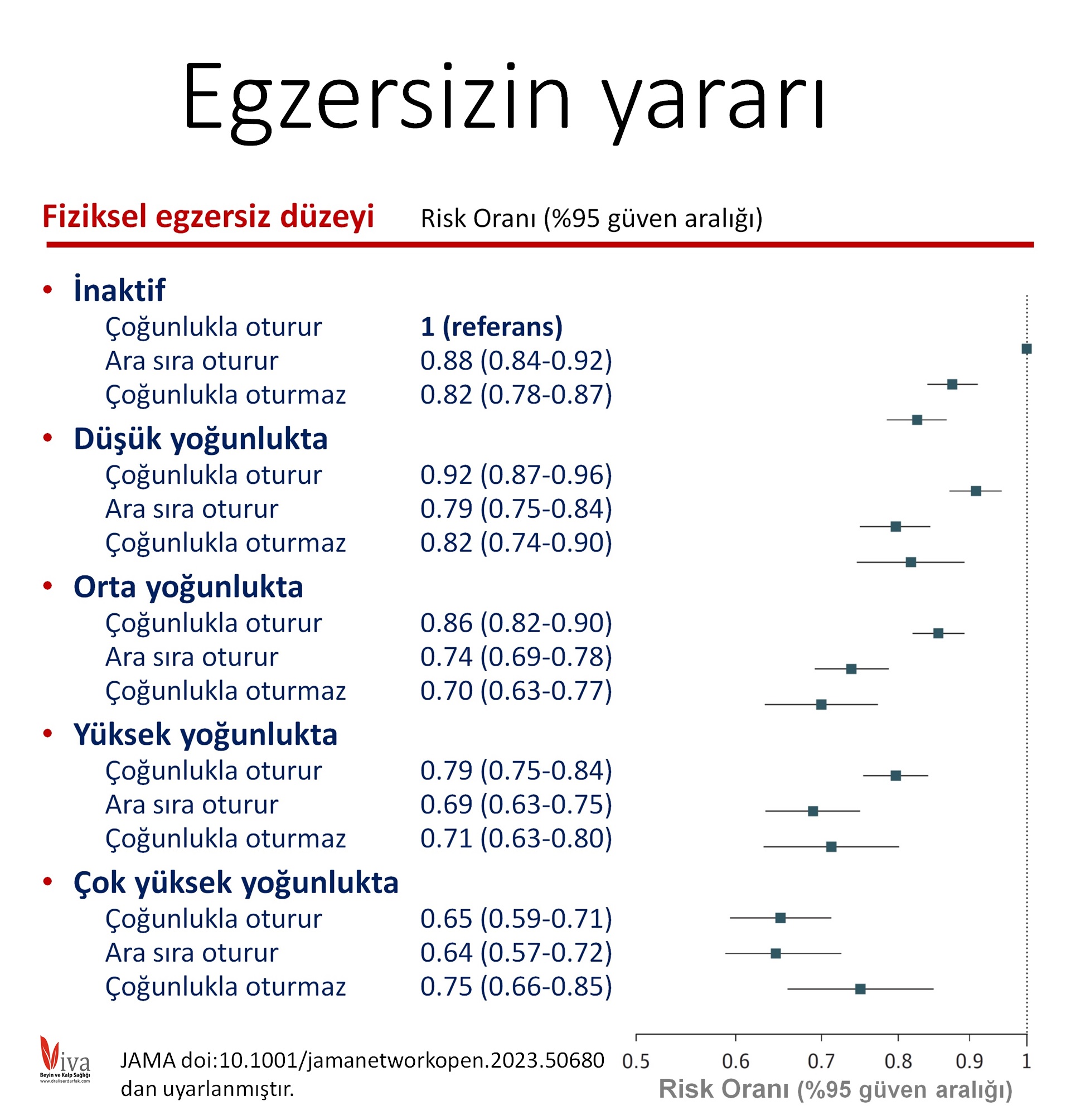 İyi haber! İş dışı serbest zamanlarda egzersiz yapmak ise iş ortamındaki hareketsizliğe karşı koruyucu (Şekil 2, grafik). Kesintili dikey çizginin sol tarafı ölüm riskinde azalmayı gösteriyor. Oturarak iş yapma derecelerine göre, hiç egzersiz yapmamakla düşük, orta, yüksek ve çok yüksek yoğunluklu egzersiz yararlı. Egzersiz yoğunluğu arttıkça, sol tarafa bakın, ölüm riski giderek daha da azalıyor.